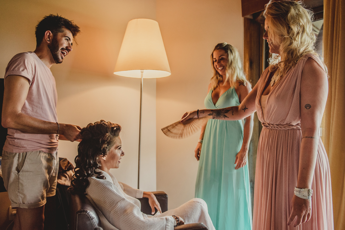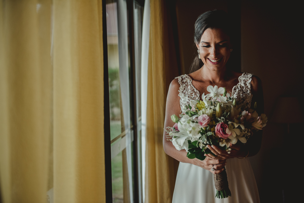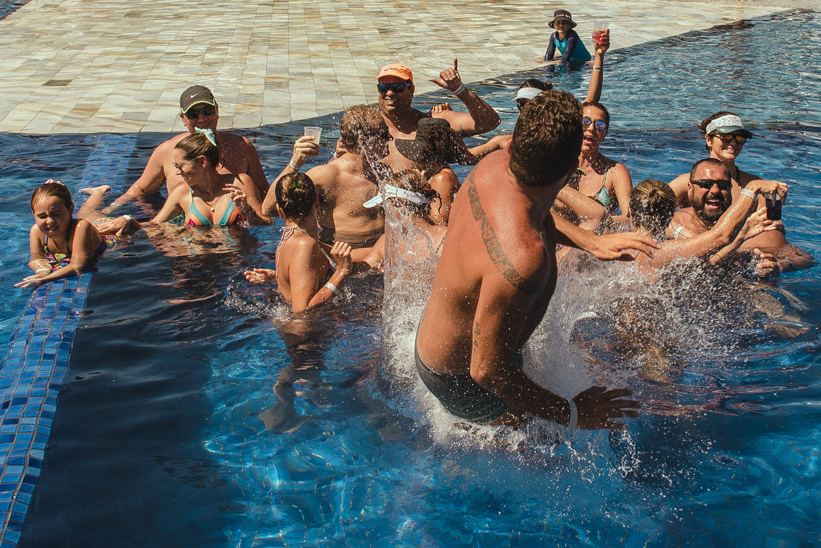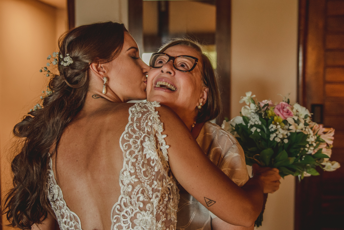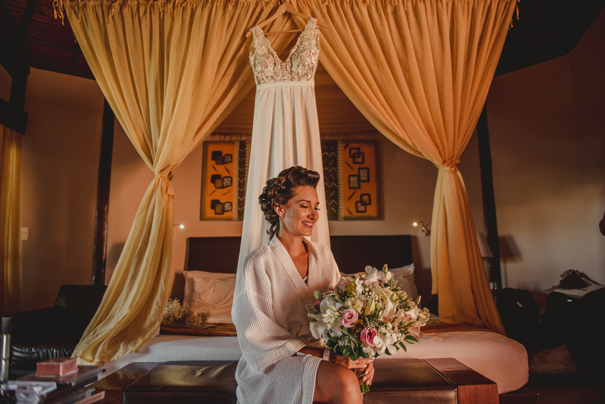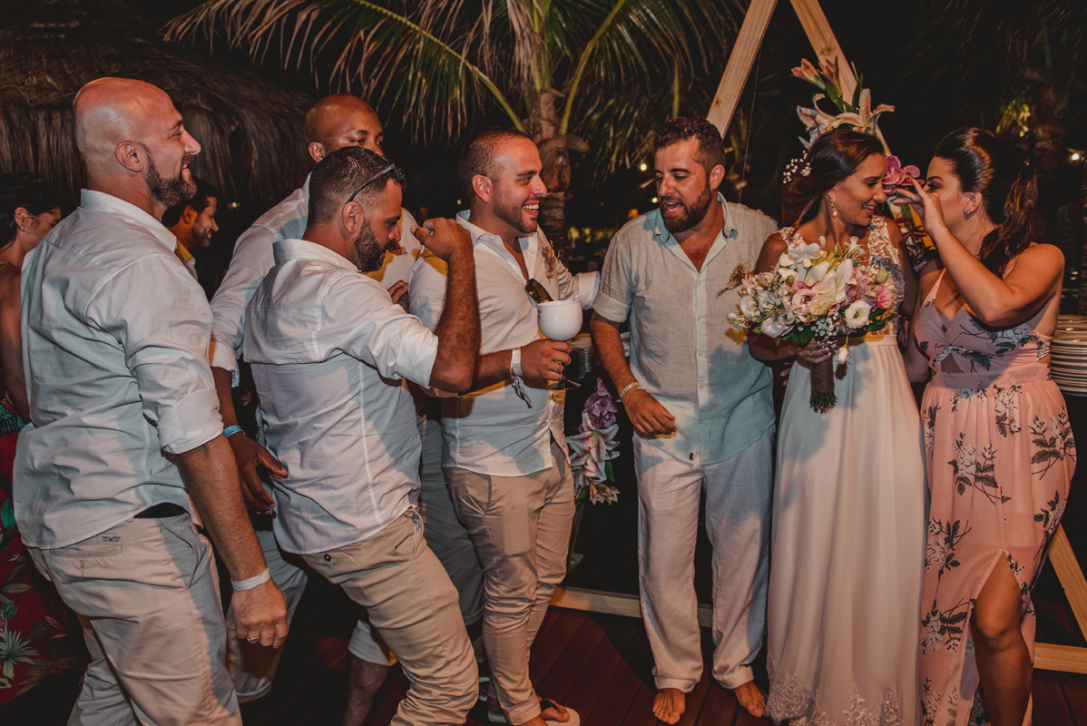 O dia começou cedo com todo mundo na piscina, logo após todos foram para os quartos e aí foi só alegria!! O noivo se arrumou com seus padrinhos e a noiva no bangalô com suas madrinhas, mãe e sogra. Por lá sempre passavam muitas amigas e toda família que estava lá pra cerimônia.
