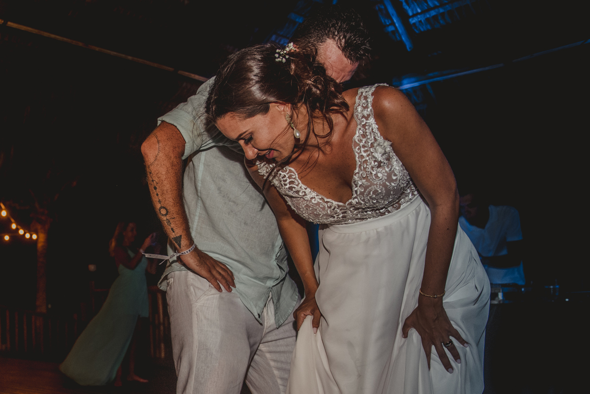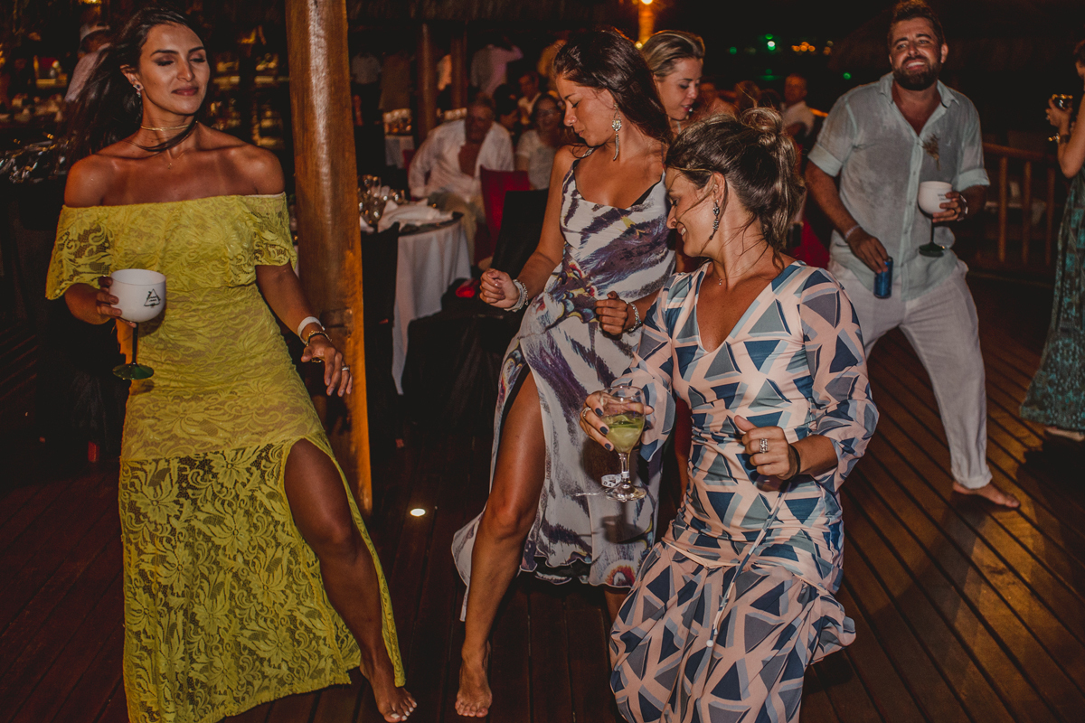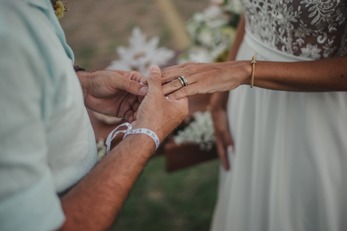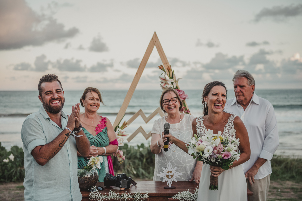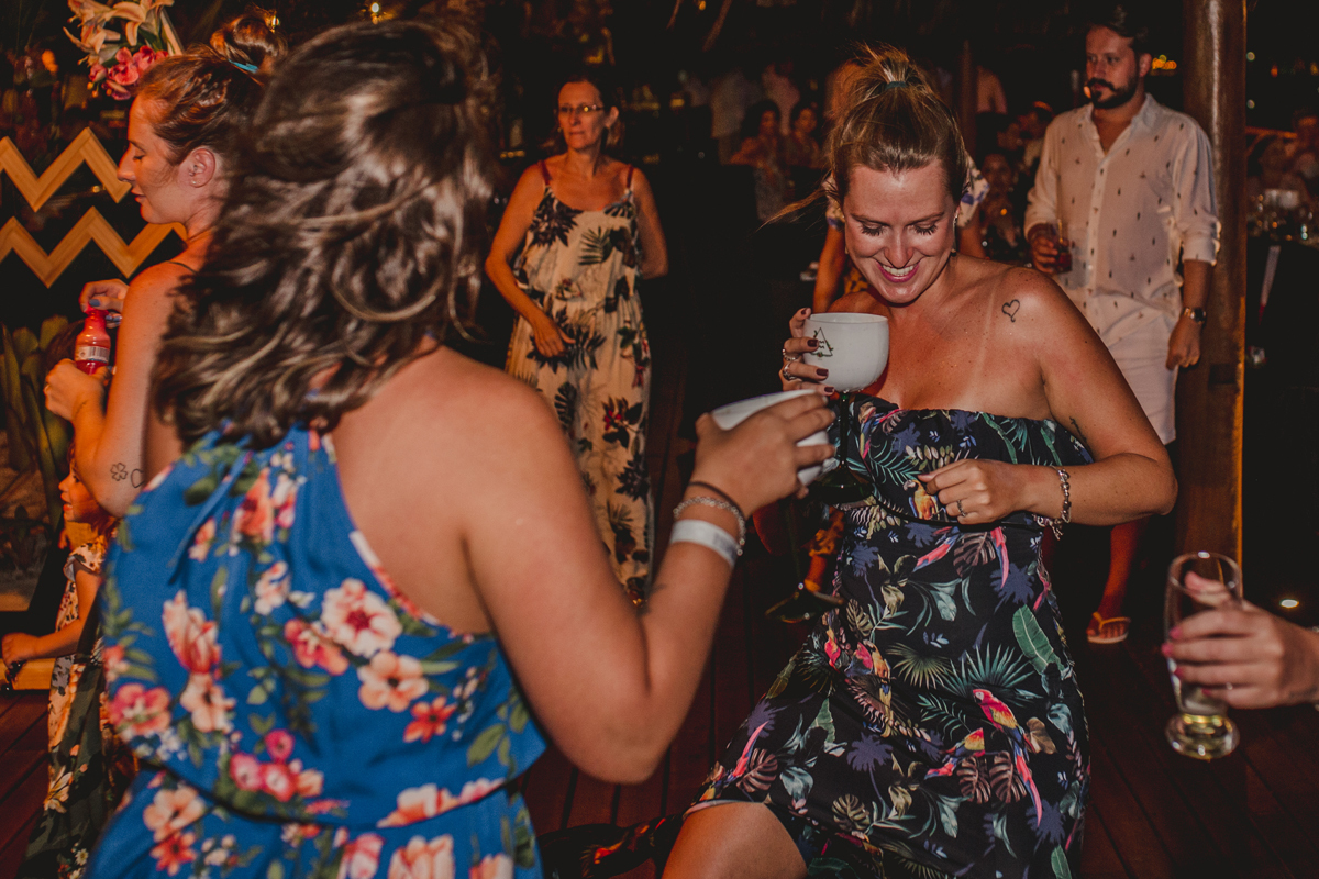 A cerimônia aconteceu exatamente no por do sol com noivo descalço, todo mundo em pé emanando boas energias, com muito amor e amizade. A festa veio logo em seguida e foi de arrebentar! Yeaaah!