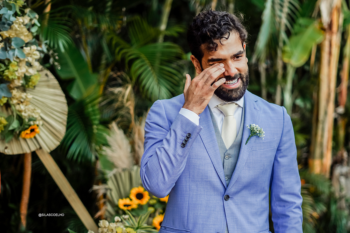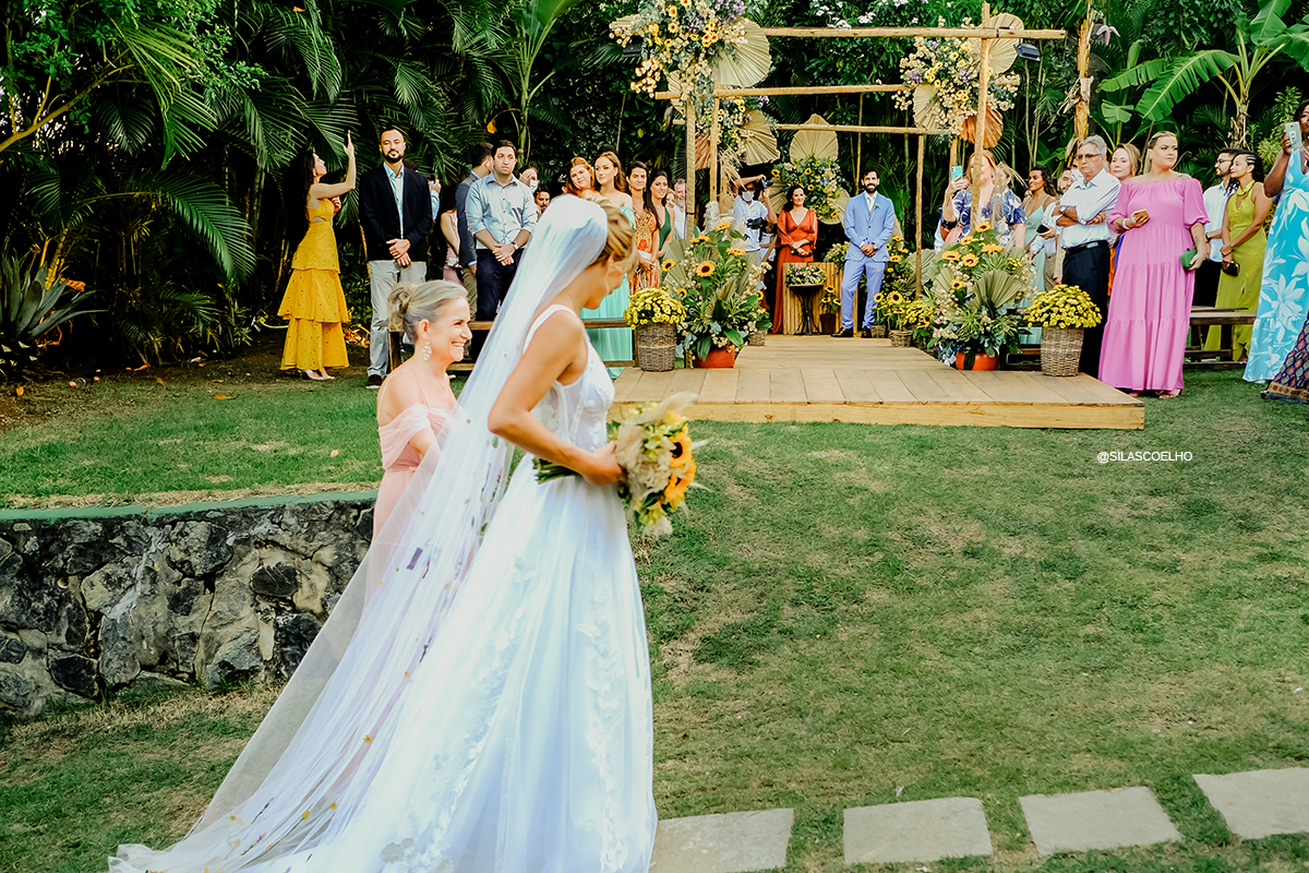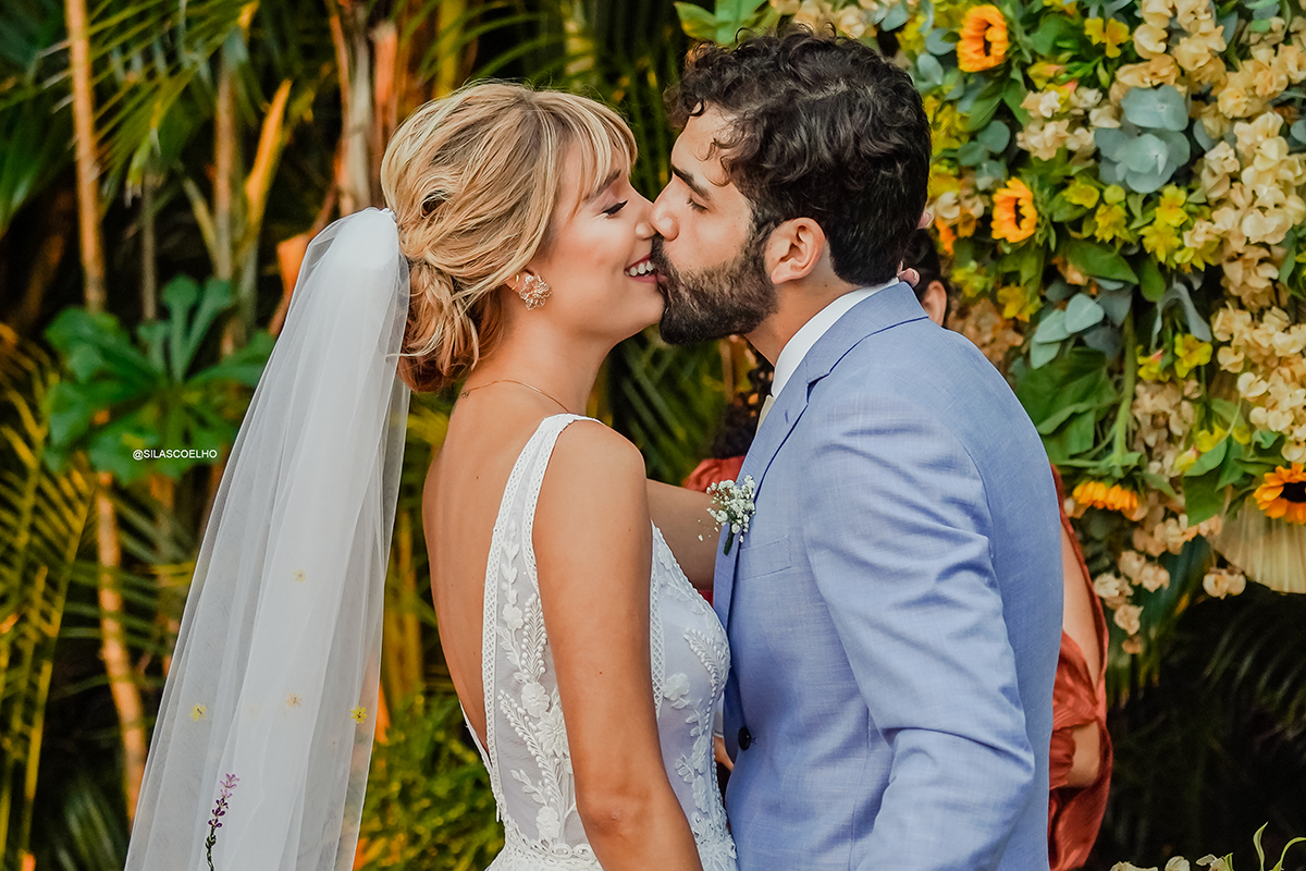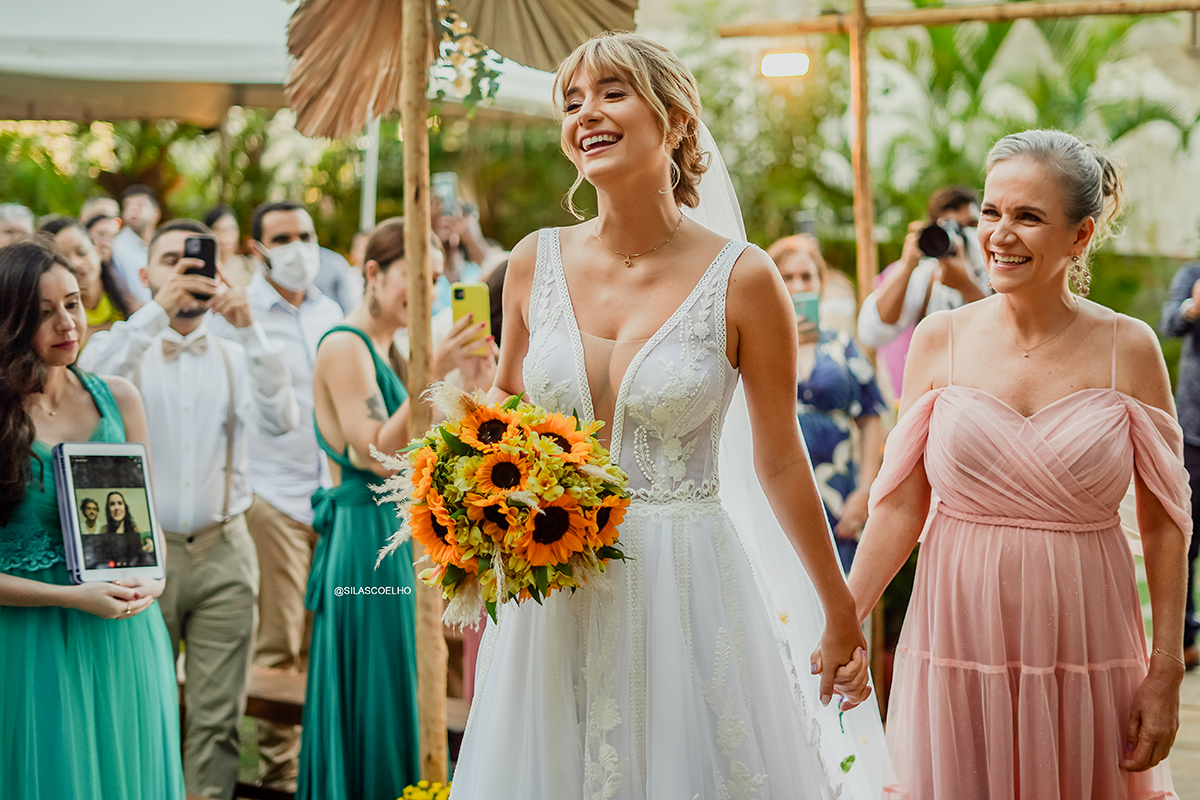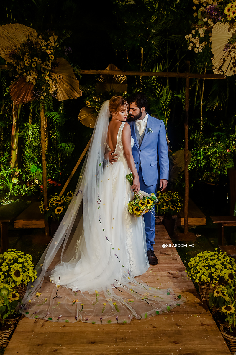 O casamento foi realizado em um jardim lindo e decorado com girassóis que representa toda a história do casal.