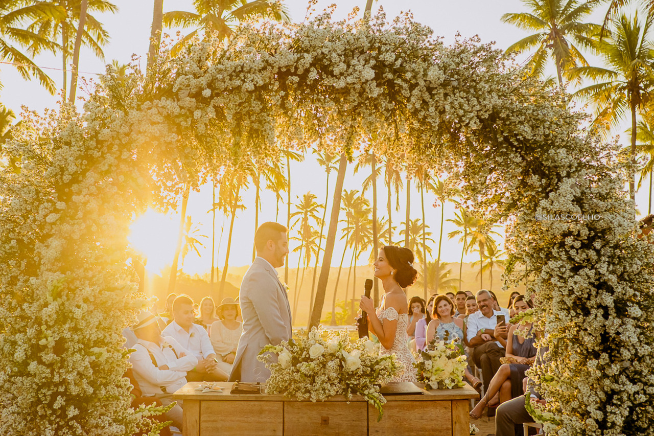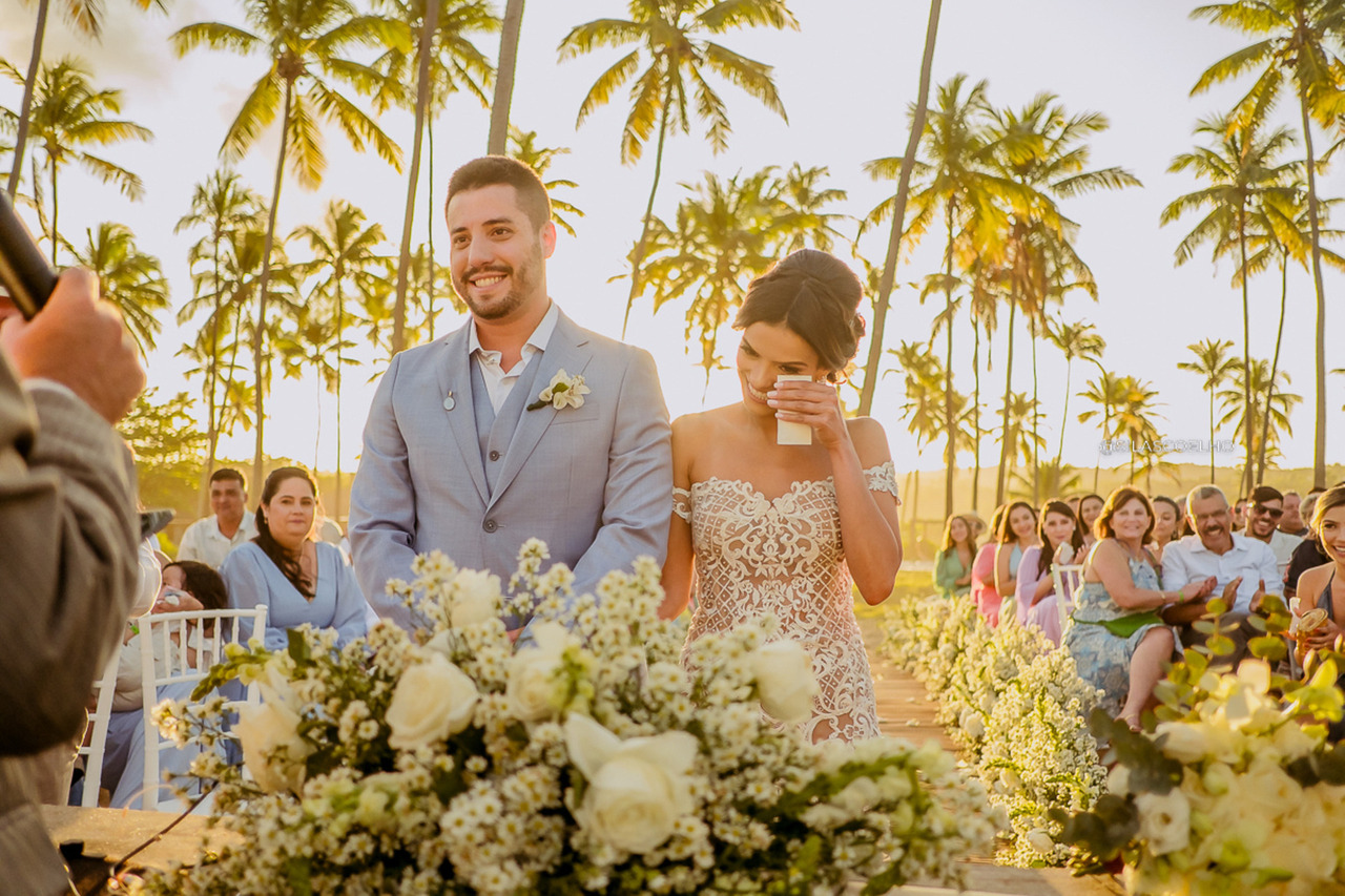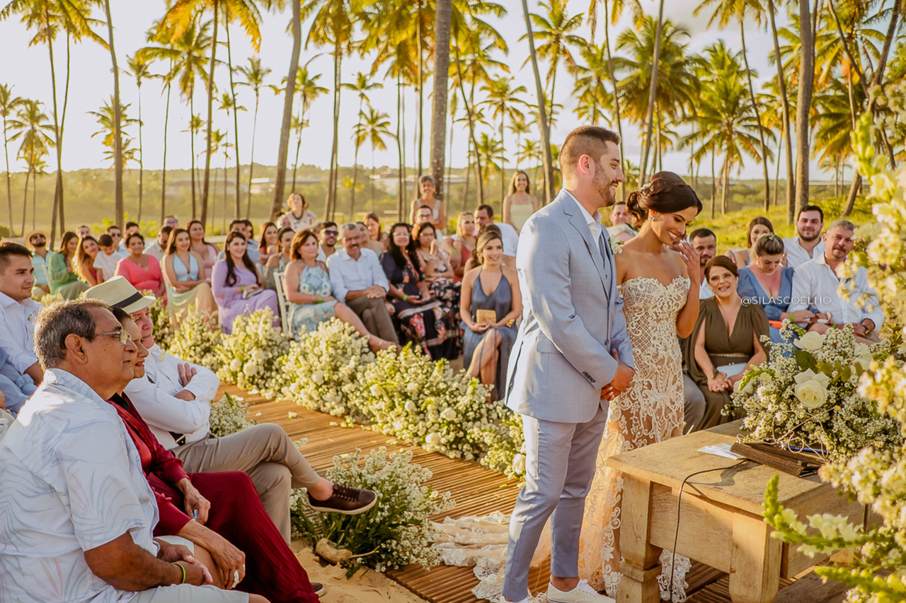 E que cerimônia! Com um pôr do sol incrível, a troca de votos e alianças foi marcada por muitas emoções e sorrisos. Os familiares e amigos mais próximos dos noivos acompanharam tudo de pertinho e não conseguiram conter as lágrimas diante de tanta beleza e amor.
