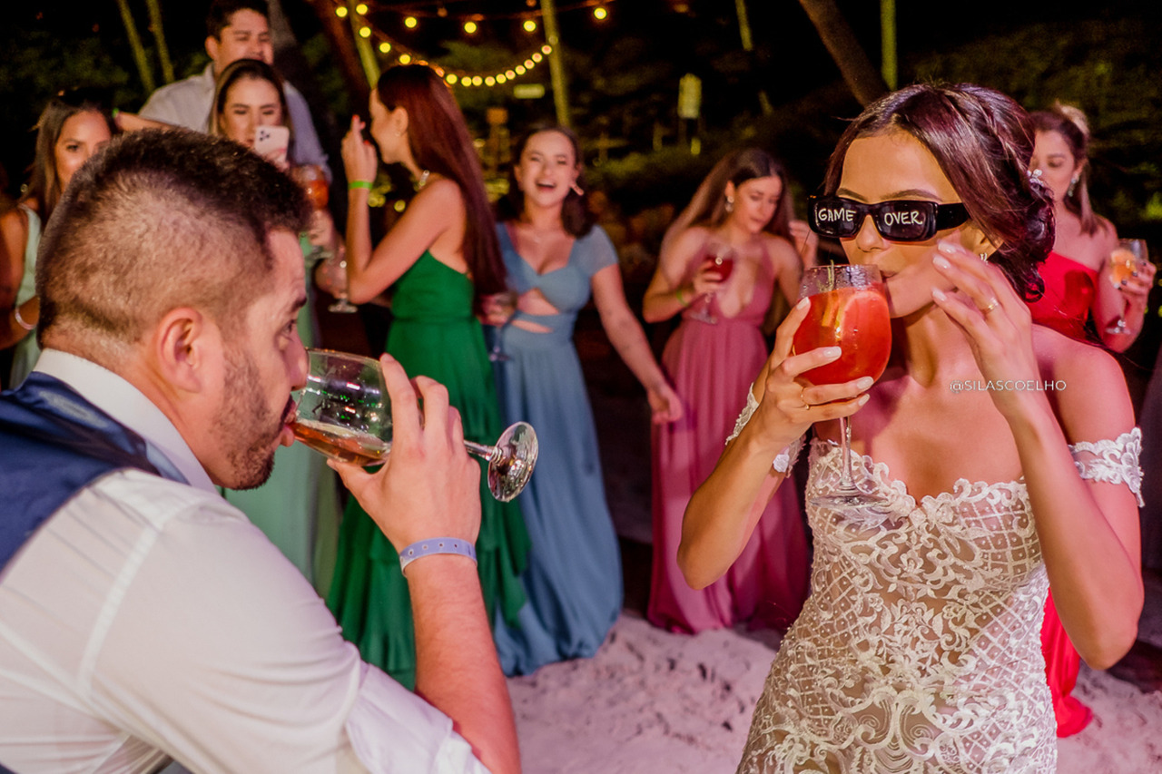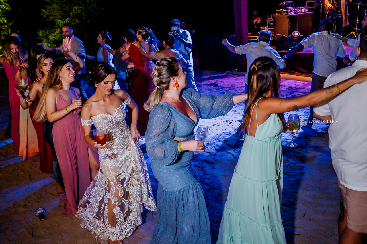 Após a cerimônia, a festa teve início com os noivos e seus convidados comemorando e se divertindo com o clima descontraído e a recepção com os pés na areia. Foi uma noite repleta de dança, alegria e muita diversão, que certamente ficará marcada na memória de todos.